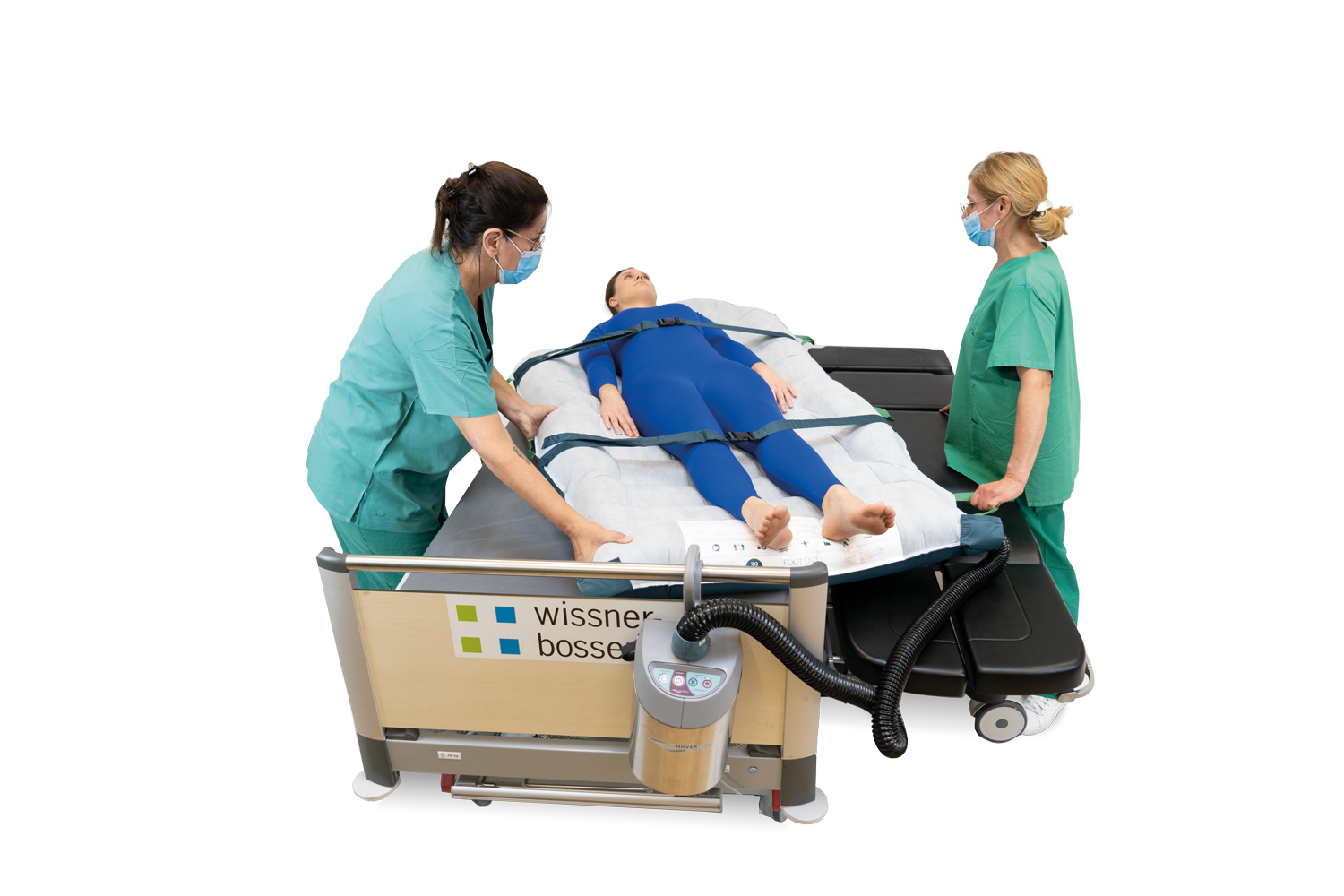 Die Matte bildet ein Luftpolster unter dem Patienten, wodurch Reibung und Scherkräfte bis zu 90 % reduziert werden können und einen nahezu reibungslosen, seitlichen Transfer und die Positionierung von Patienten ermöglichen.